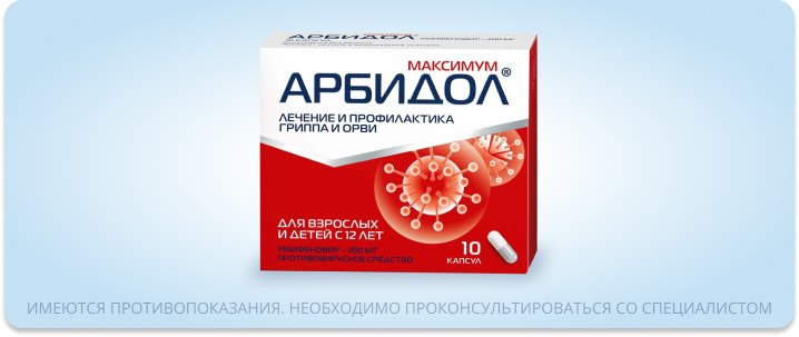 Суспензия и таблетки от гриппа «Арбидол» предназначены для малышей с двух и трех лет соответственно, капсульные формы применяются у детей постарше (с 6 и 12 лет в зависимости от дозировки) и взрослых. Рассмотрим «взрослое» лекарство — «Арбидол® Максимум» дозировкой 200 мг.